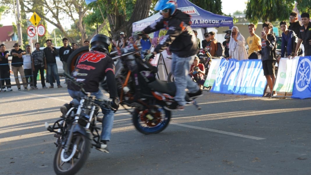Salah satu atraksi yang paling mencuri perhatian adalah ketika seorang stunt rider mengangkat roda depan motor sambil membawa penumpang perempuan. Momen itu sontak membuat penonton menahan napas sebelum akhirnya bersorak kagum.