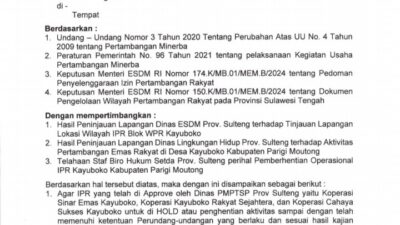 Keputusan itu tertuang dalam surat bernomor 500.10.2.3/243/RO.Hukum tertanggal 26 Juni 2025, yang ditujukan kepada Kepala Dinas Penanaman Modal dan Pelayanan Terpadu Satu Pintu (DPMPTSP) serta Kepala Dinas Energi dan Sumber Daya Mineral (ESDM) Provinsi Sulawesi Tengah.