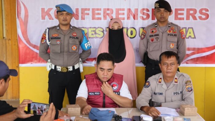 Tersangka perempuan bersama barang bukti 51 gram sabu dihadirkan Polres Tojo Una-Una dalam konferensi pers kasus narkotika. Foto: Polres Parigi Moutong